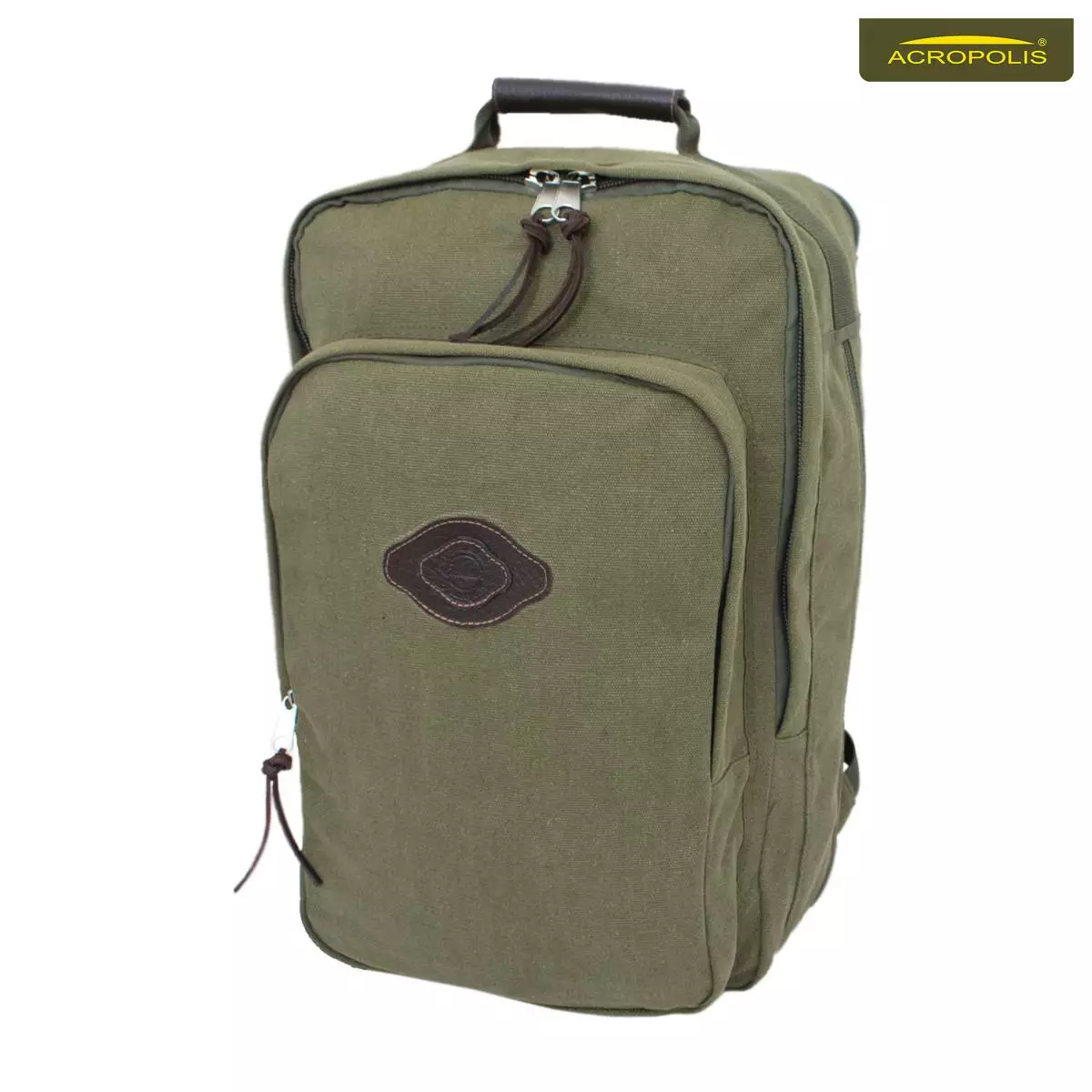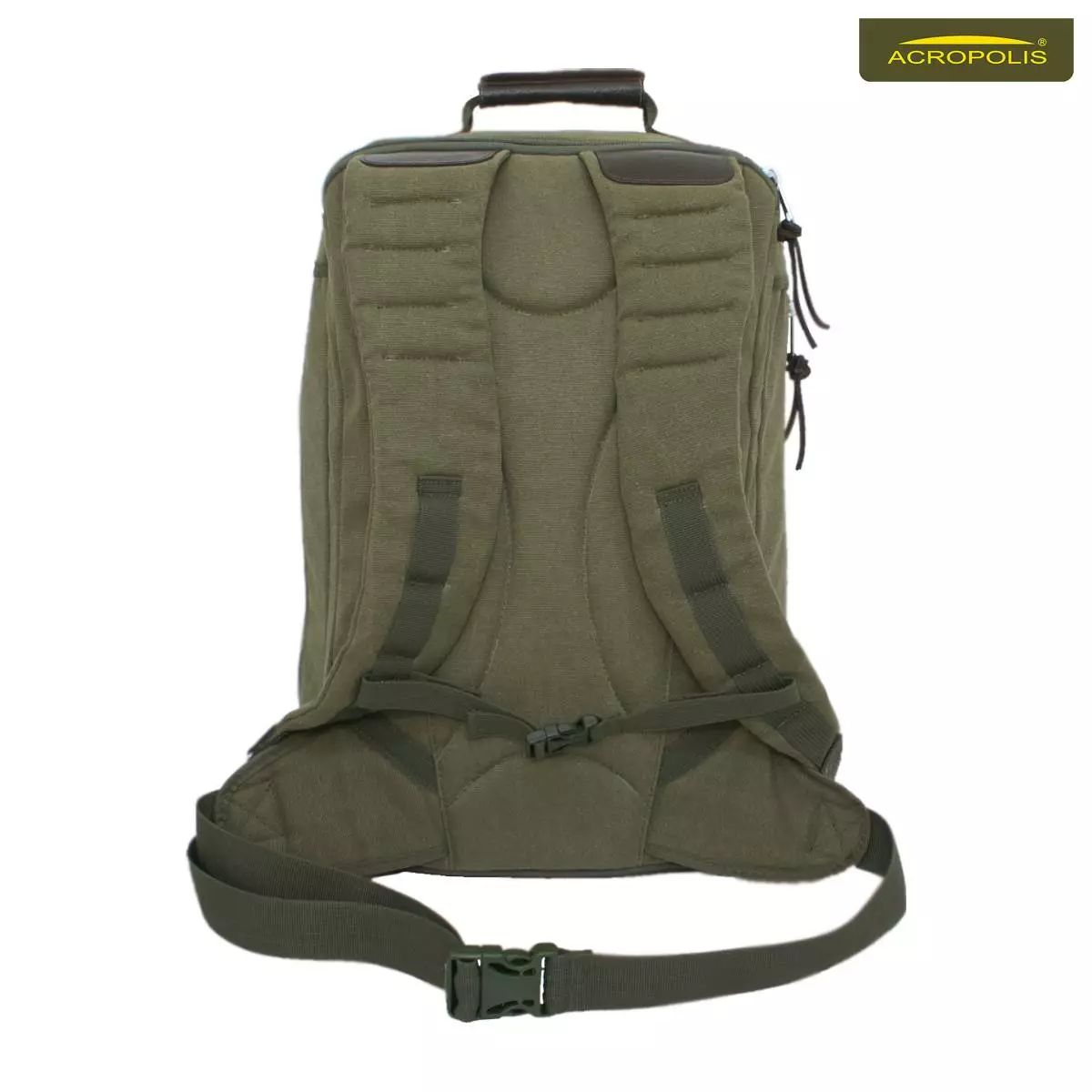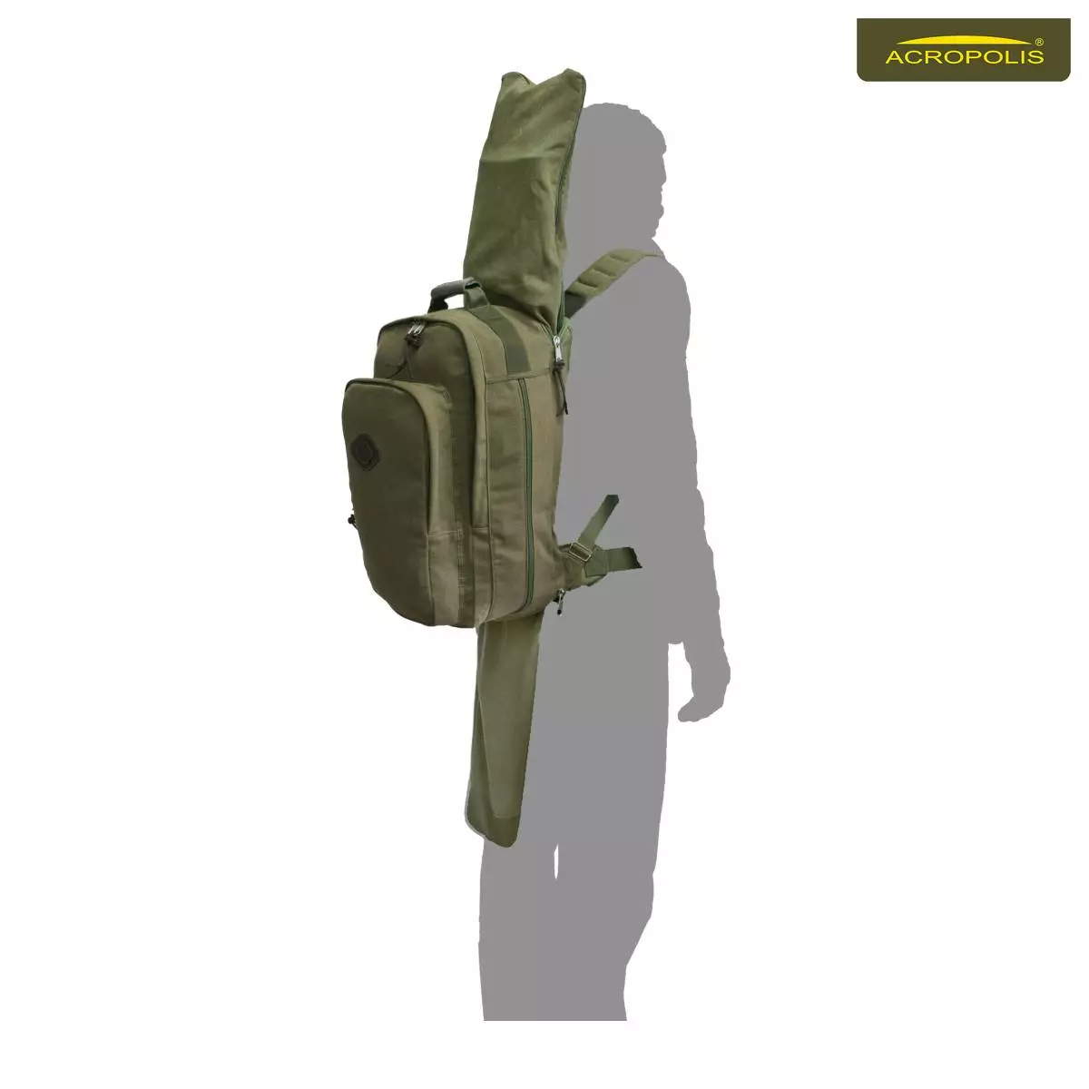Брезентовий рюкзак для мисливців Акрополіс РМ-5. Основне відділення призначене для транспортування габаритного мисливського спорядження. В разі потреби збільшується в об'ємі. Для цього в конструкції виробу передбачений замок-блискавка, який мисливець може розстебнути і вивільнити сховану частину відділення.