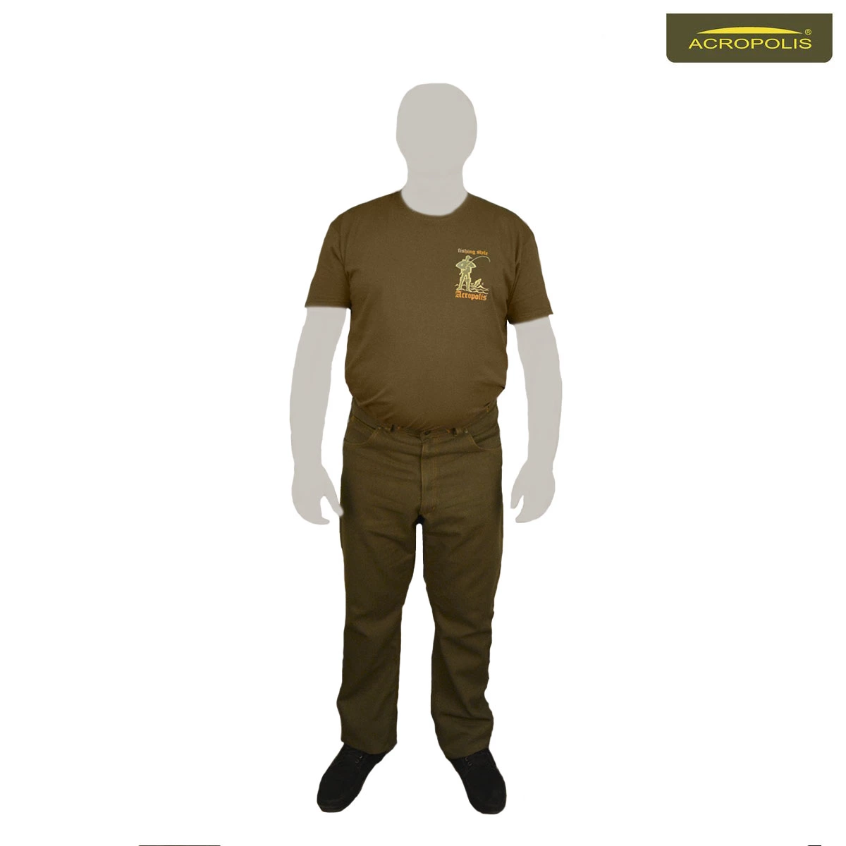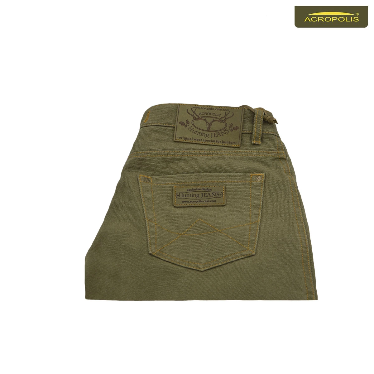 Дизайн джинсів від Акрополіс включає в себе всі атрибути класичних штанів для чоловіка: по дві допоміжні кишені спереду та ззаду, надійний замок-блискавка та металева фурнітура. Густе плетення теплих ниток тканини додатково захищає від укусів комах, жуків, подряпин від гілок і каміння, та вологи від мокрої трави.