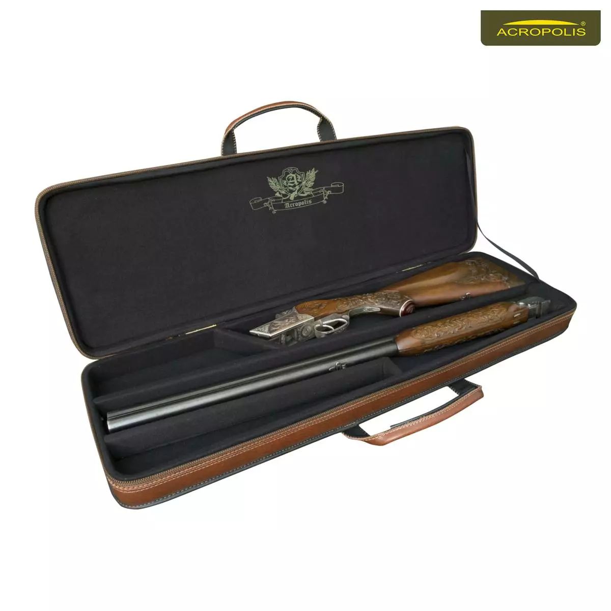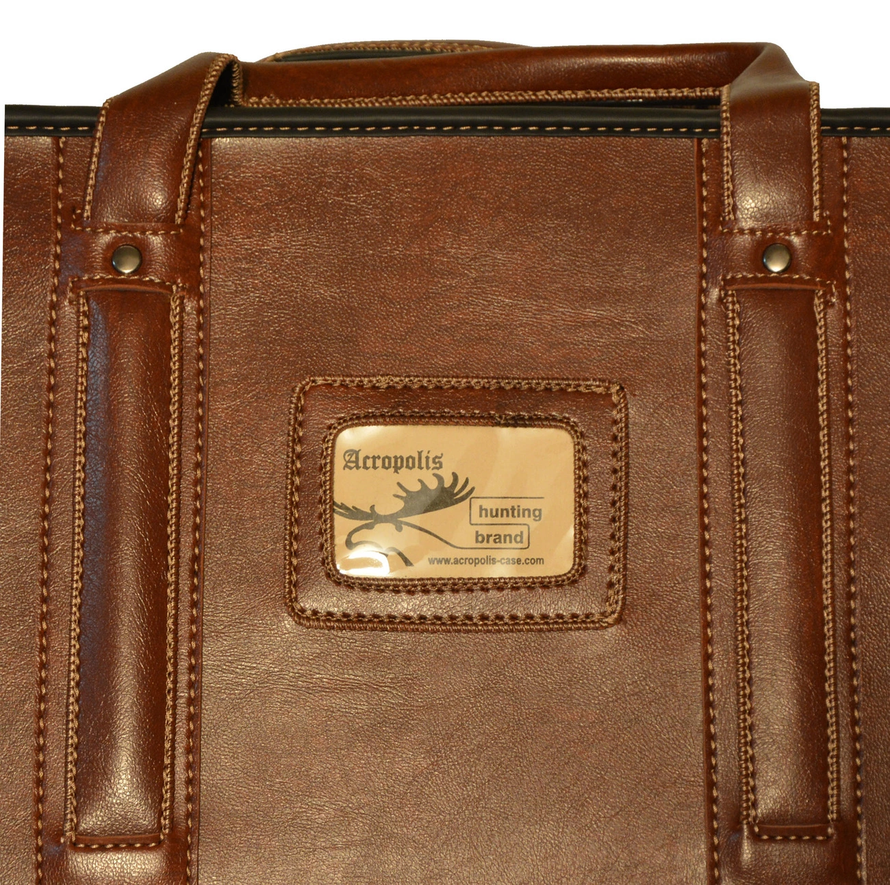 Футляр Акрополіс ФЗ-3б - жорсткий кофр на фанерній основі для розкладної гладкоствольної зброї. Зверху ручка з м’якою накладкою для зручного транспортування. Ручки додатково прошиті та укріплені хольнітенами. Краї матеріалу зміцнені та захищені обметувальним швом. В середині кофру розміщені жорсткі перегородки, які формують відділення для ствола, прикладу, набору для чищення, ременя та аксесуарів. Для надійної фіксації елементів зброї в комплект додаються подушки. Футляр додатково закривається двома ременями з металевими пряжками. На передній стінці розміщена прозора кишеня з ПВХ плівки для ідентифікатора. Футляр комплектується пакувальним чохлом із нетканого матеріалу.