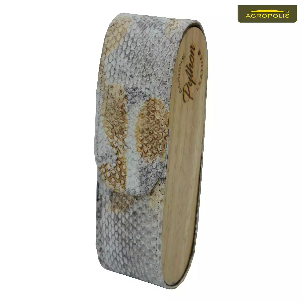 Презентабельний футляр для окулярів преміум класу зі шкіри рептилії. В оригінальному дизайні поєднались вишуканість та розкіш шкіри пітона з лаконічними елементами натурального дерева. Конструкція надійна з металевими складовими. Верхній клапан закривається на магніт, збоку оригінальний надпис вигравіюваний лазером. Футляр має вертикальну форму та класичні розміри для окулярів з корекції зору. Жорсткий каркас дозволяє без обмежень носити виріб в бічній кишені піджака чи сумки.