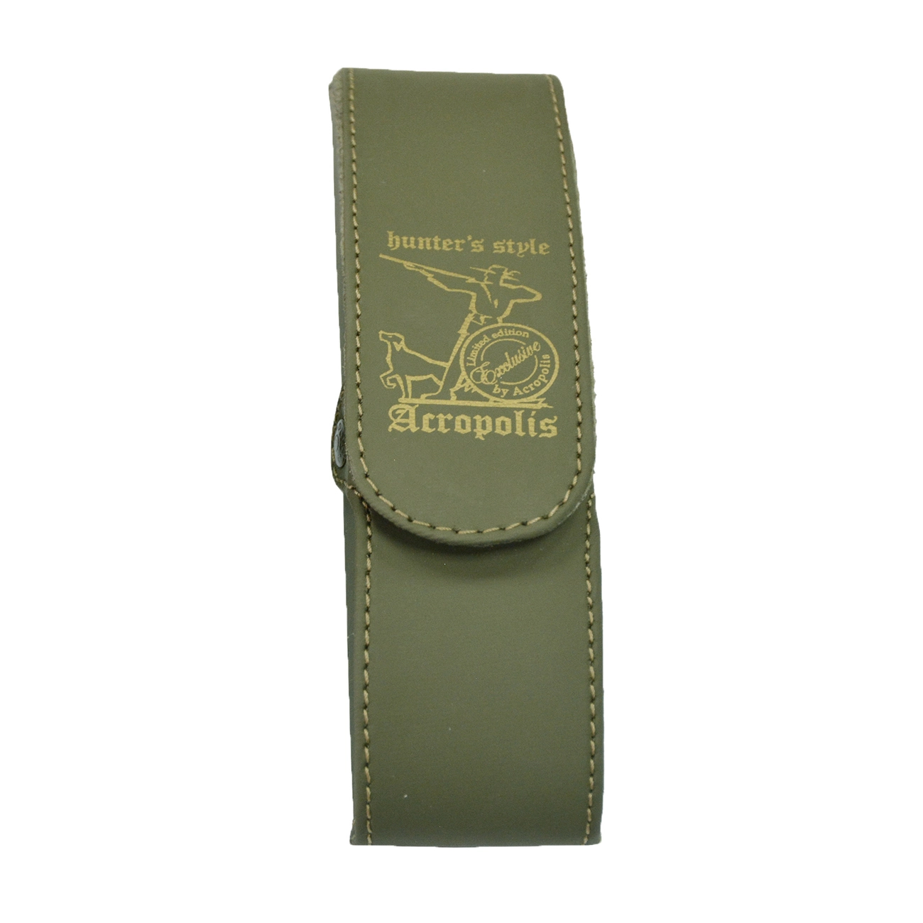 Вертикальний футляр з тематичним малюнком для вузьких окулярів. Колір - оливковий. Виготовлений із зносостікого матеріалу, який добре витирається. На одній із сторін є кріплення на пояс. Краї чохла прошиті та зафіксовані брендованими кнопками Acropolis. Футляр закривається на магнітну кнопку. В середині виробу – флісова підкладка.