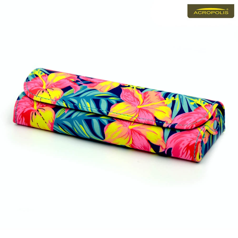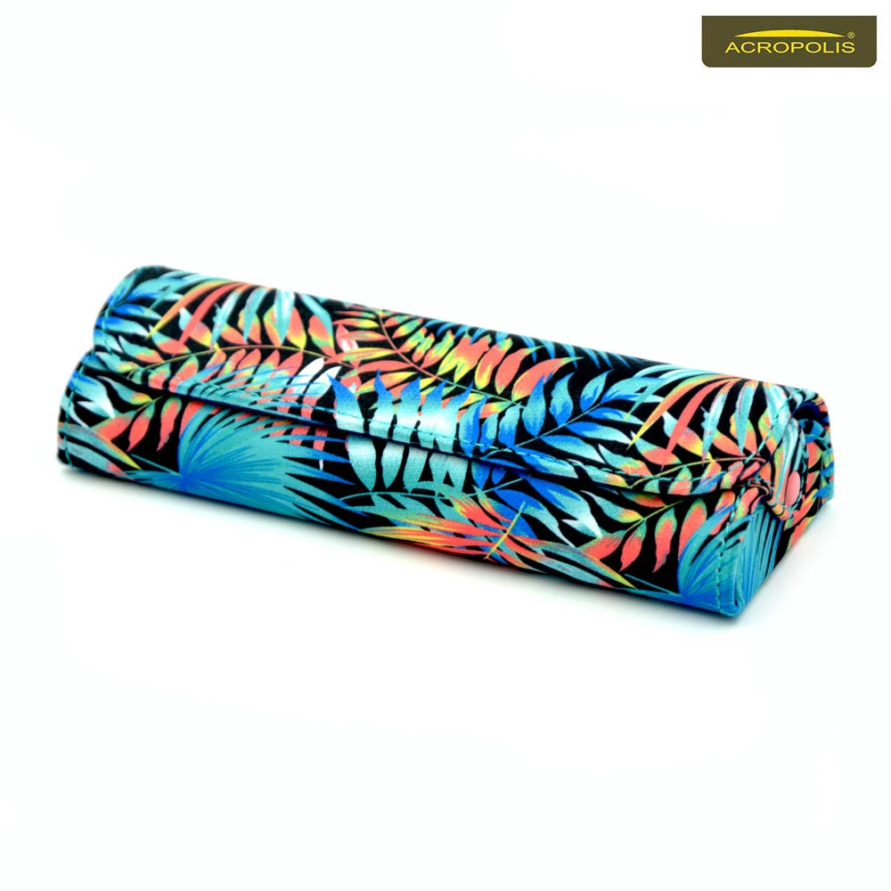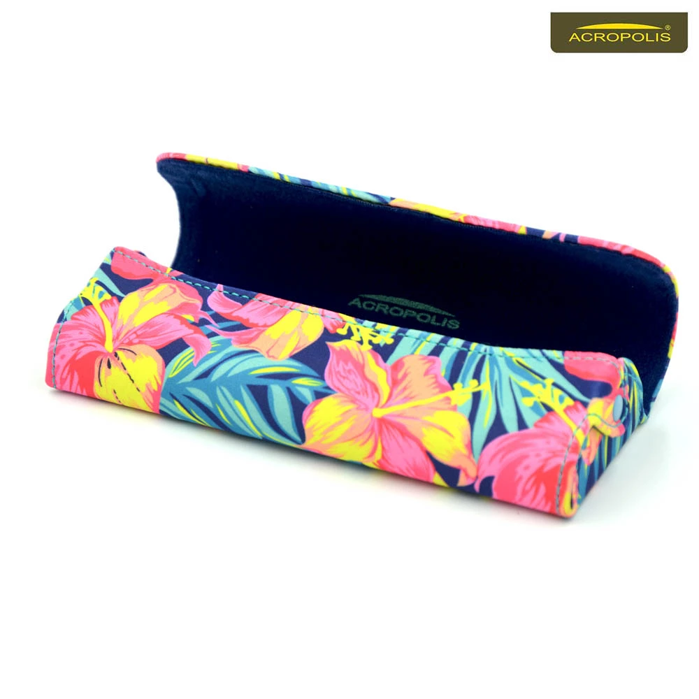 Вишуканий футляр з магнітною застібкою для коригуючих окулярів, виготовлений з металу, приємного на дотик текстилю та підкладки з велюру. Вбереже оправи від механічних подряпин і бруду. Компактний розмір чохла та яскравий принт з квітами і тропічною зеленню часто обирають жінки, особливо влітку.