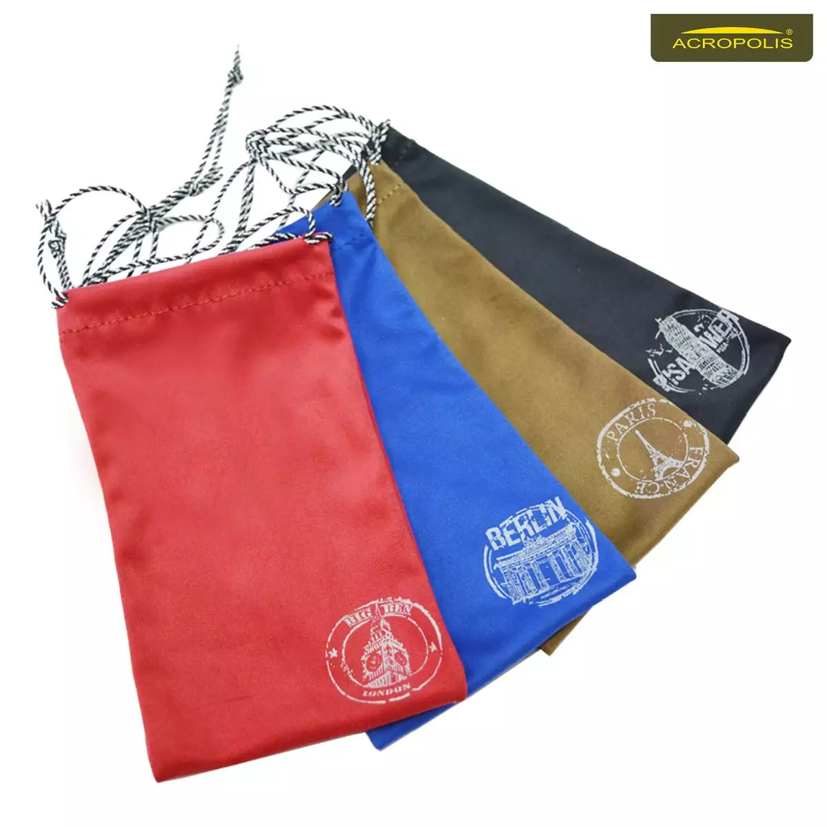 М'який мішечок з мікрофібри для зберігання окулярів. Зверху затягується на шнурок. Внизу малюнок із зображенням символів, що асоціюються з тим, чи іншим європейським містом.