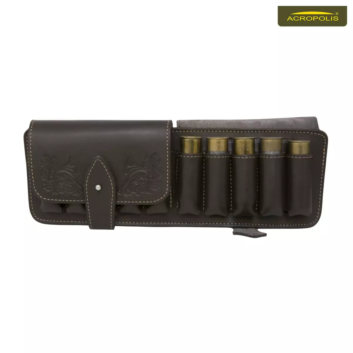 Шкіряний патронташ на 10 набоїв для гладкоствольної зброї. Підсумок підходить патронів від 20 до 12 калібру. Набої розміщені в один ряд, поділені на дві секції і закриваються двома клапанами. Для надійного закривання кожен клапан має застібку типу кобурний гвинт. Футляр виготовлений в класичному стилі з рельєфним тисненням. Для виготовлення футляру використовується товста натуральна шкіра та високоміцні нитки. Всі елементи прошиті по контуру. Кріплення на пояс виконанні за допомогою двох широких накладок на тильній стороні, розраховані на пояс шириною до 4 см. Такий спосіб кріплення запобігає зісковзуванню та зміщенню під час ходьби. Елементи кріплення підсилені чотирма заклепками (хольнітенами). Витончений дизайн та відмінні матеріали патронташу забезпечать вам задоволення від його використання.