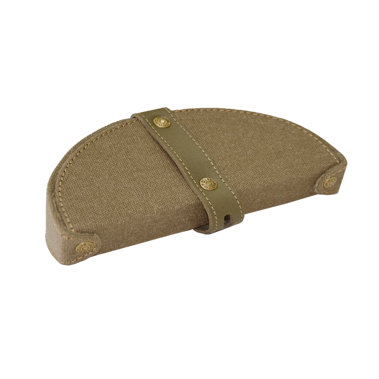 Футляр твердого типу призначений для зберігання великих сонцезахисних окулярів. При виробництві чохла використовують 100% бавовну. Каркас металевий з картонними вставками.Окремі елементи дизайну – зроблені з натуральної шкіри. Латунними кнопками вони закріплені до корпусу виробу та формують кріплення для фіксації на поясний ремінь і під карабін рюкзака. З внутрішньої сторони – нашита підкладка з флісу. В комплект до футляру також входить серветка з мікрофібри для протирання окулярів.