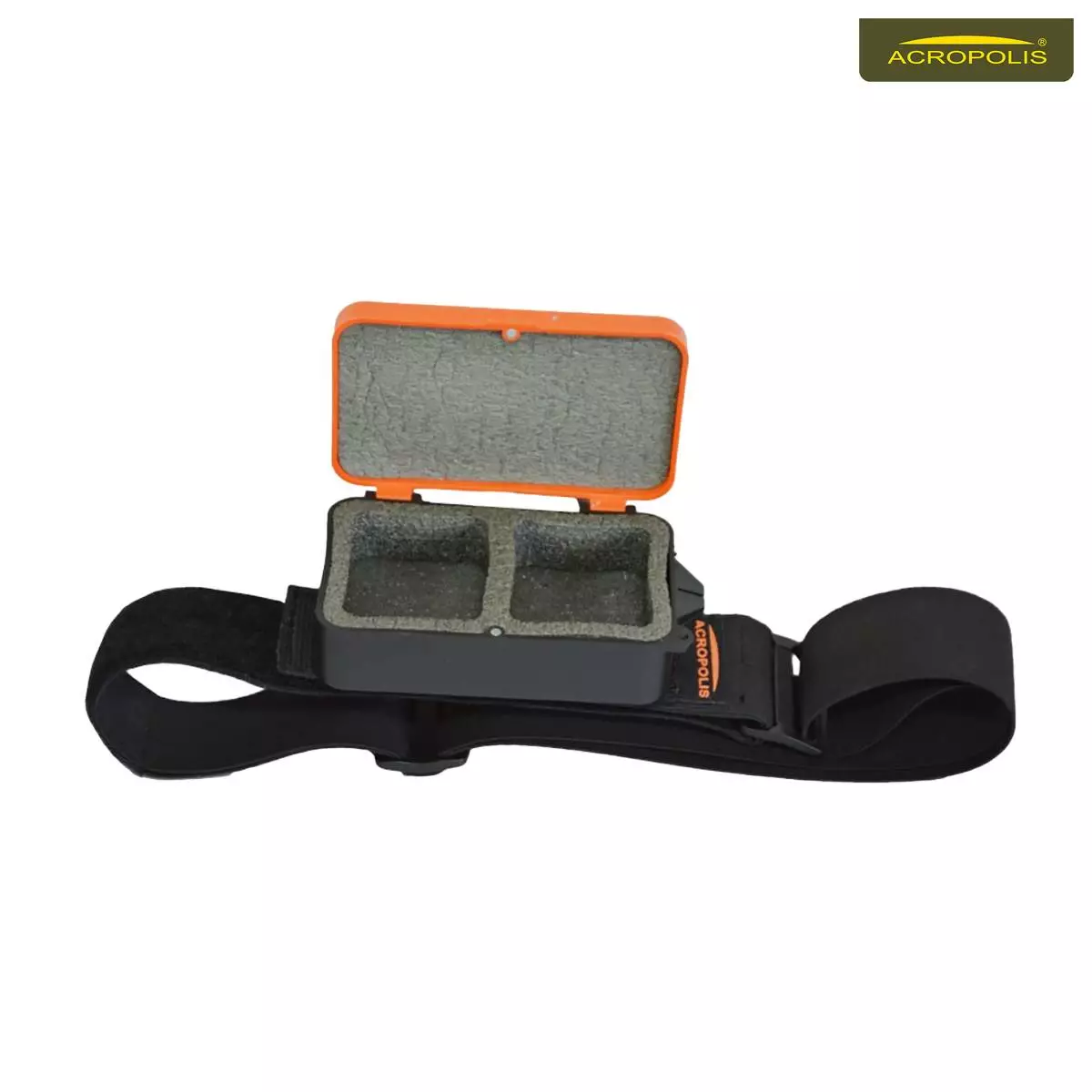 Коробка мотильниця Acropolis КМП-2 для зимової рибалки. Використовується зимою для зберігання мотиля, опариша і мормиша. Коробка мотильниця зберігає тепло і перешкоджає промерзанню наживки. Коробка кріпиться до платформи на стегно за допомогою текстильної застібки-«липучки». Платформа коробки КМП-2 кріпиться на стегно за допомогою текстильної липучки.