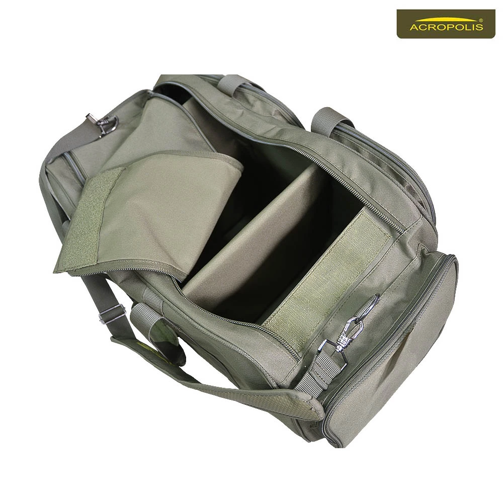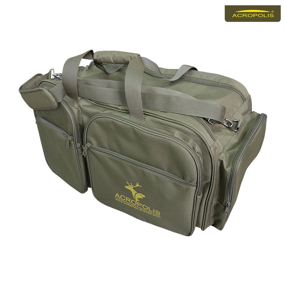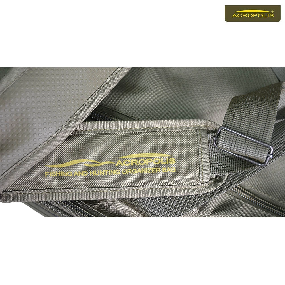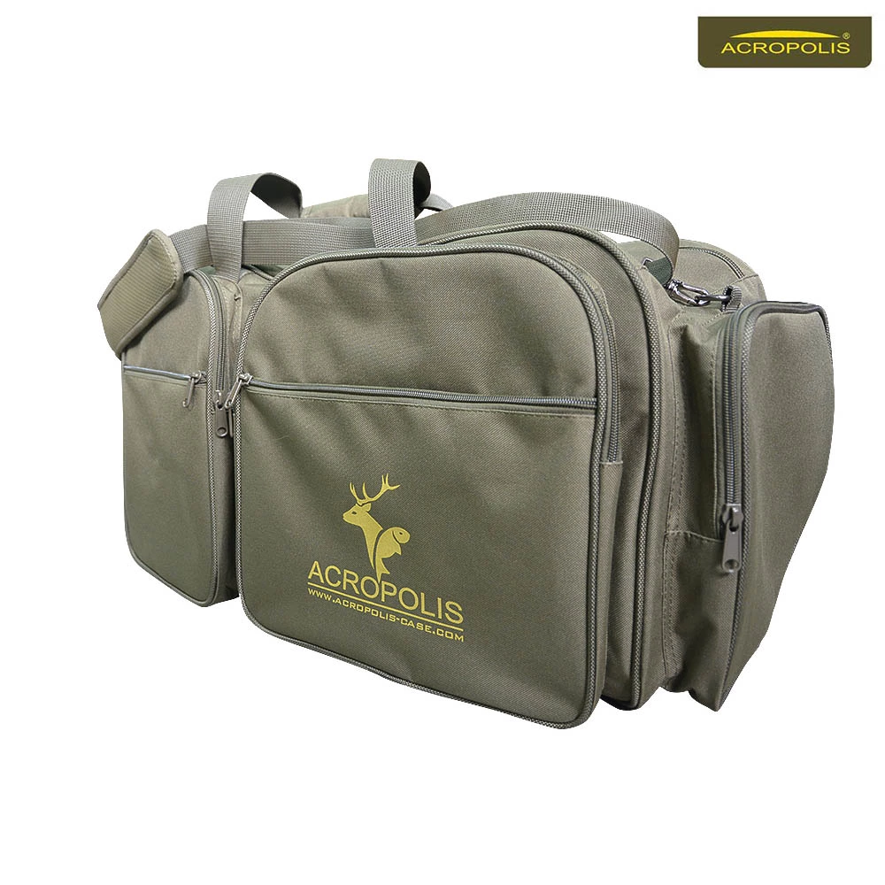 Велика мисливсько-рибальська сумка транспортна Акрополіс МРС-1. Має надійну тришарову конструкцію з верхнім вологостійким матеріалом, ущільненими стінками з пінополіетиленом та внутрішньою підкладкою з поліестеру 75 ден. Центральне відділення зручно відкривається відкидним клапаном з двома блискавками. Достатньо містке та функціональне. В середині 2 жорсткі зйомні перегородки.