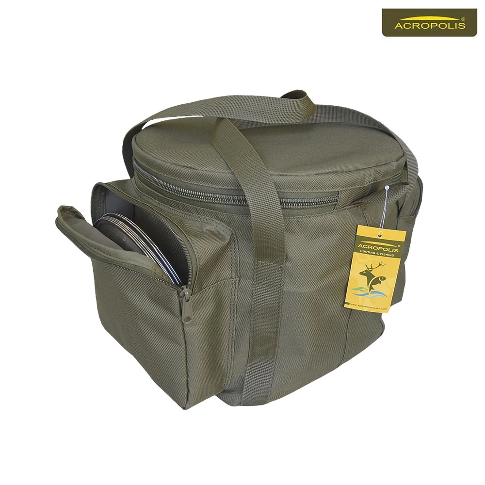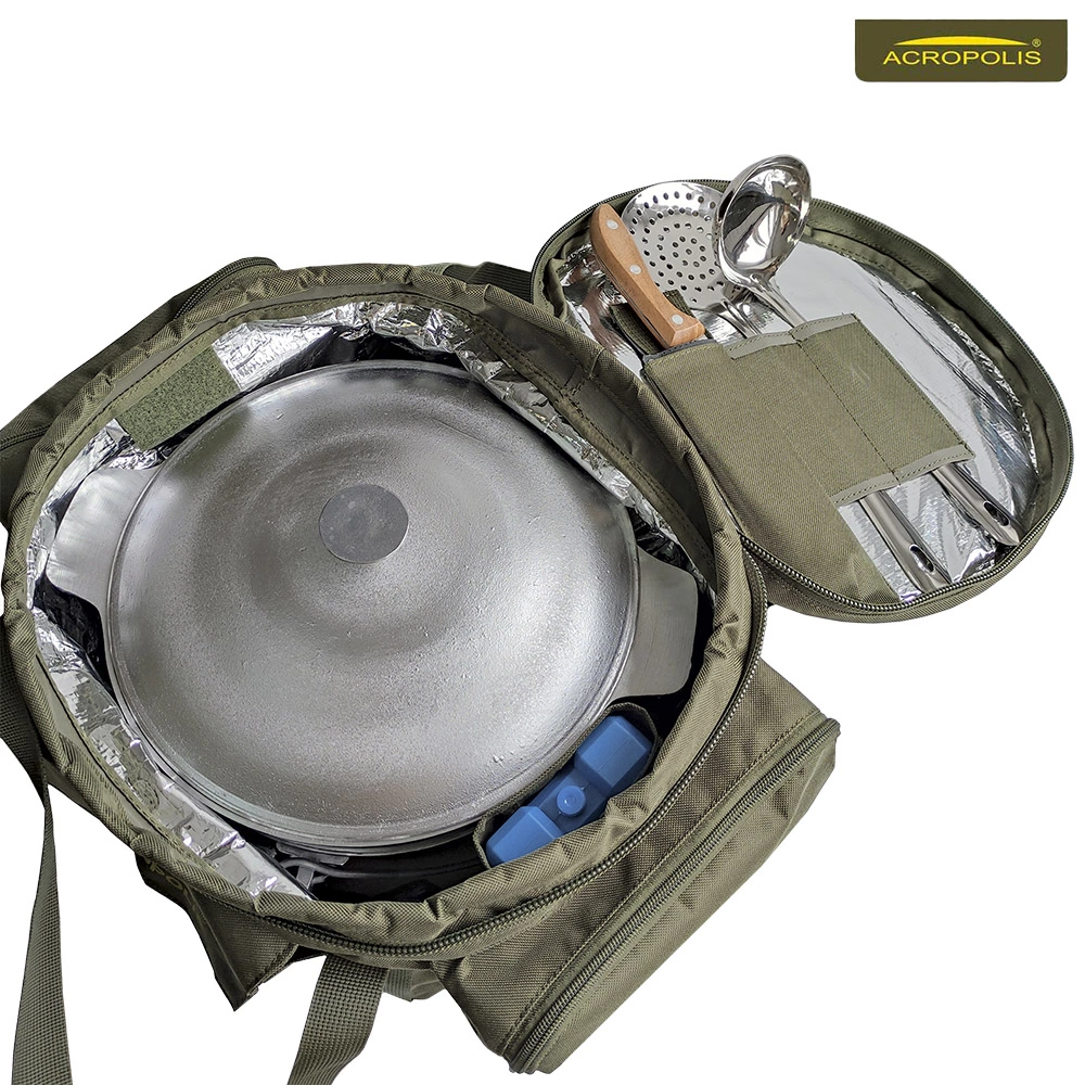 Сумка має укріплені стінки, 2 ручки для транспортування, що прошиті по усій довжині. Верхній металевий обідок вшитий в середині, робить комфортним процес складання і викладання кухонного посуду на риболовлі, пікніку чи полюванні. Сумка тримає форму та призначена для тривалого використання.