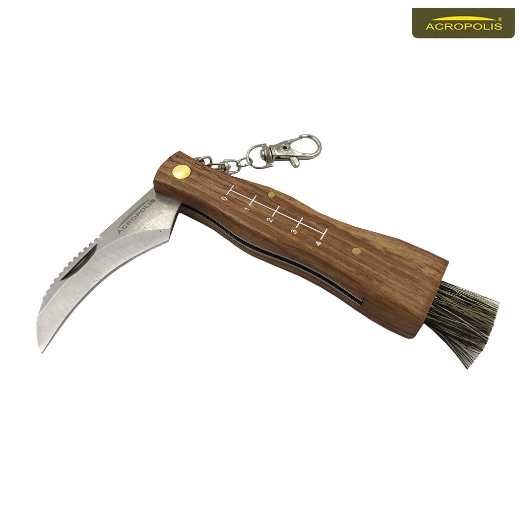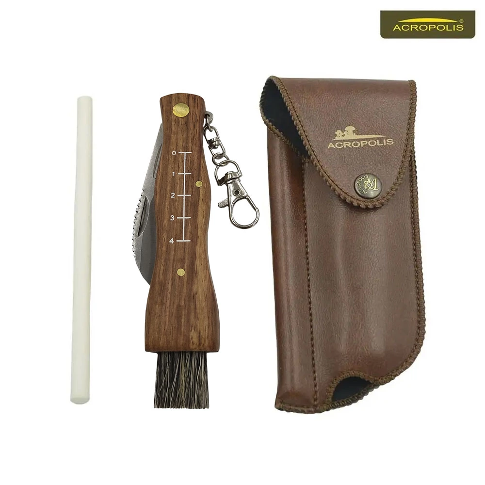 Дерев’яна ручка ергономічної форми зручно лежить в руці. В нижній частині - металевий карабін з ланцюжком. Його кріплять до стрічок, шлейок сумки, рюкзака або поясу. Ніж можна зачепити як окремо, так і в чохлі. Для цього в основі футляру передбачений невеликий отвір під застібку. Під час збирання грибів укомплектований набір носять в кошику, відрі або на ремені штанів. Чохол має свою шлейку, через яку протягується класичний брючний ремінь.