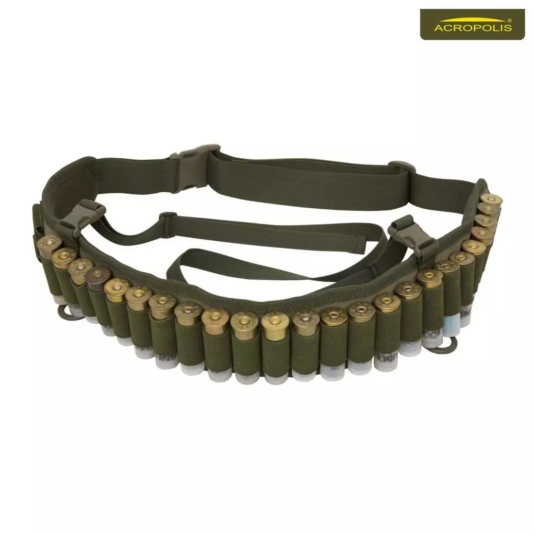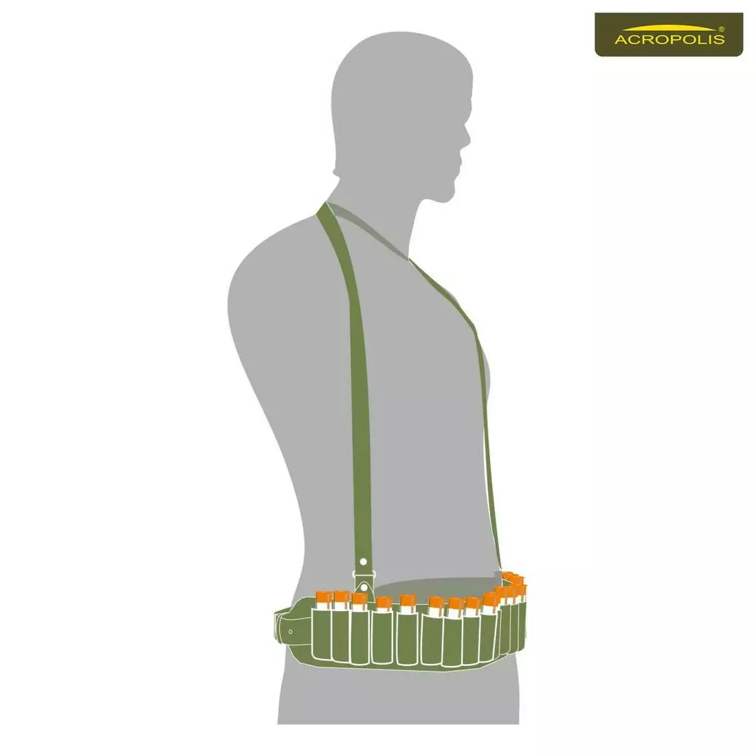 Пояс-патронташ з брезенту та неопренових стрічок розрахований на перенесення 20 набоїв гладкоствольної зброї 12-20 калібру. В комплекті розвантажувальний ремінь на плече. Останній допомагає краще розподілити навантаження на спину людини під час тривалого полювання. Адже велику кількість патронів не так легко носити на поясі, особливо взимку. Пояс-патронташ та ремінь розвантажувальний регулюються по довжині залежно від антропометричних даних мисливця. Кожен патрон має свій окремий надійний фіксатор.