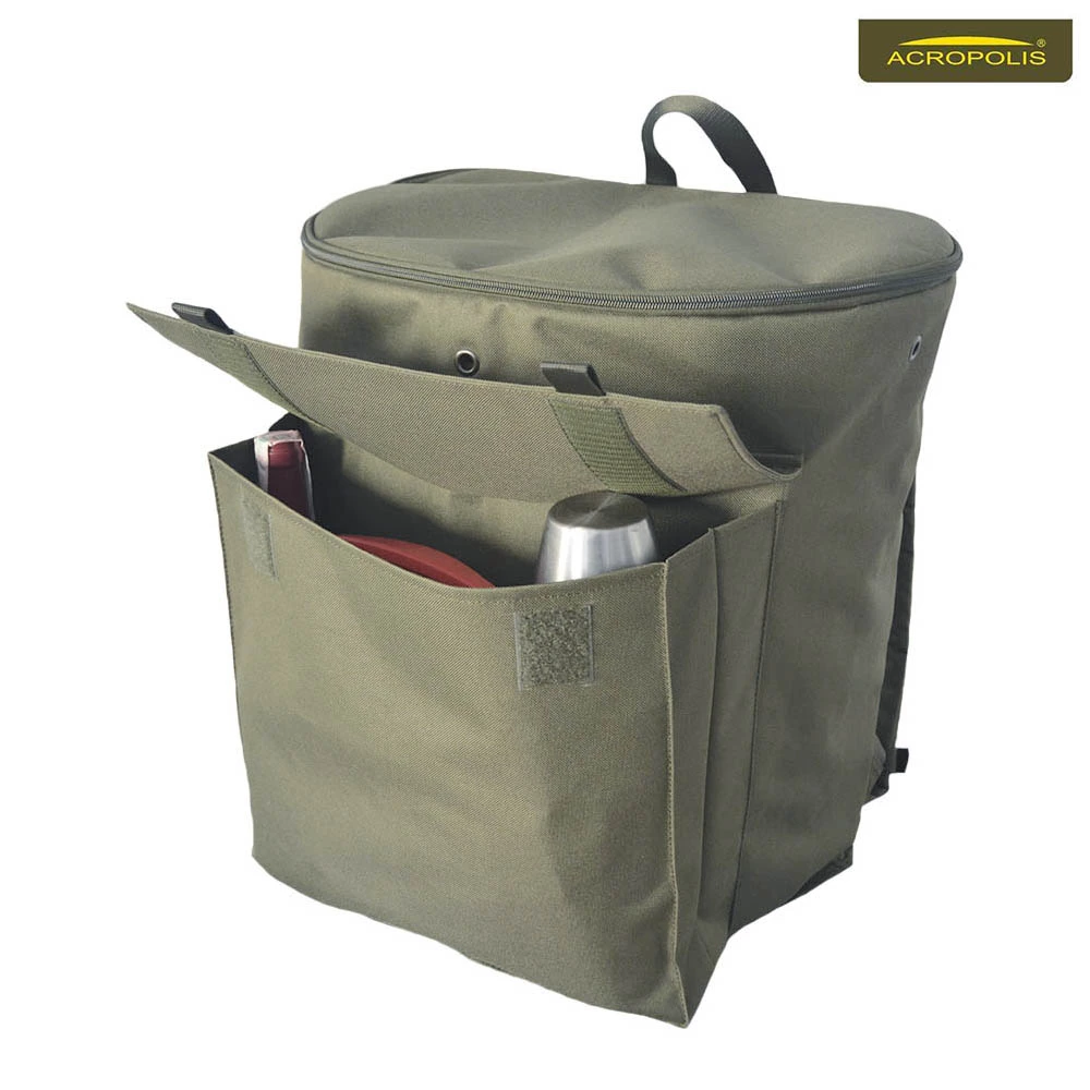 Спереду до рюкзака пришита велика кишеня для їжі, напоїв або різних аксесуарів, підручних засобів грибника. Закривається вона на застібки типу «липучки».