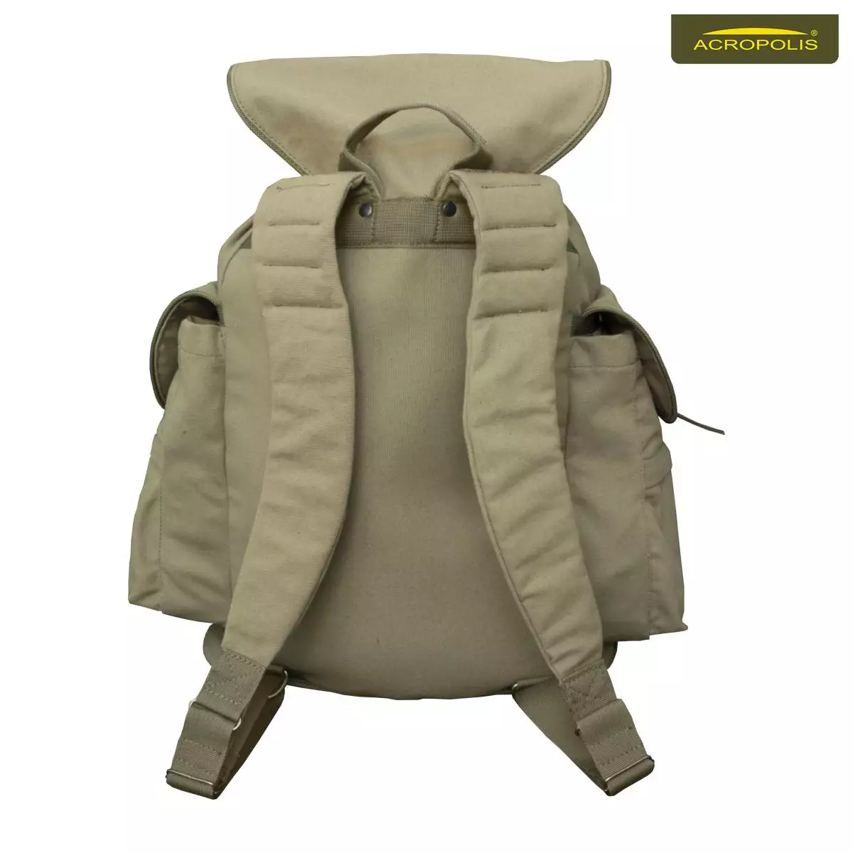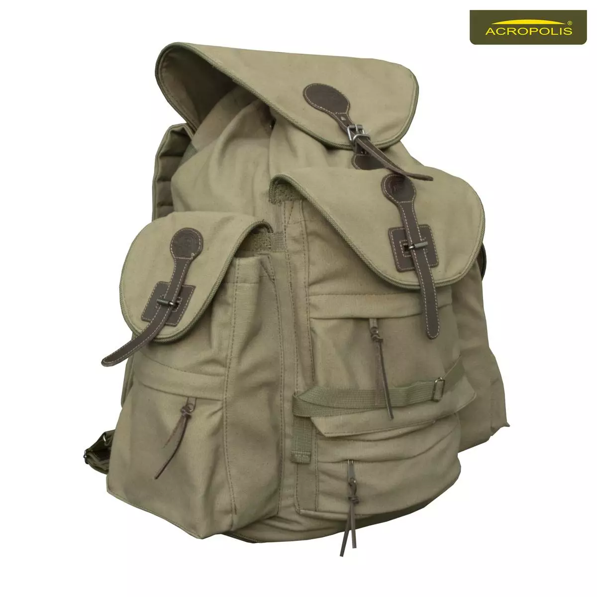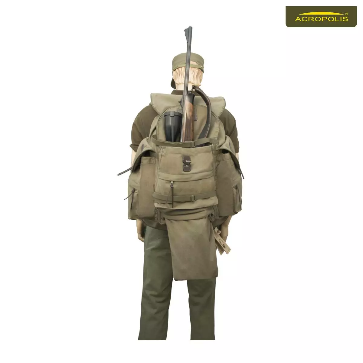 Рюкзак мисливський Акрополіс РМ-1. Виготовлений з брезентової тканини (80% бавовна і 20% поліестр) та окремих вставок з натуральної шкіри спеціальної вичинки. Класичний дизайн рюкзака для полювання: об'ємне центральне відділення для речей, три зовнішні кишені та відсік для зброї.