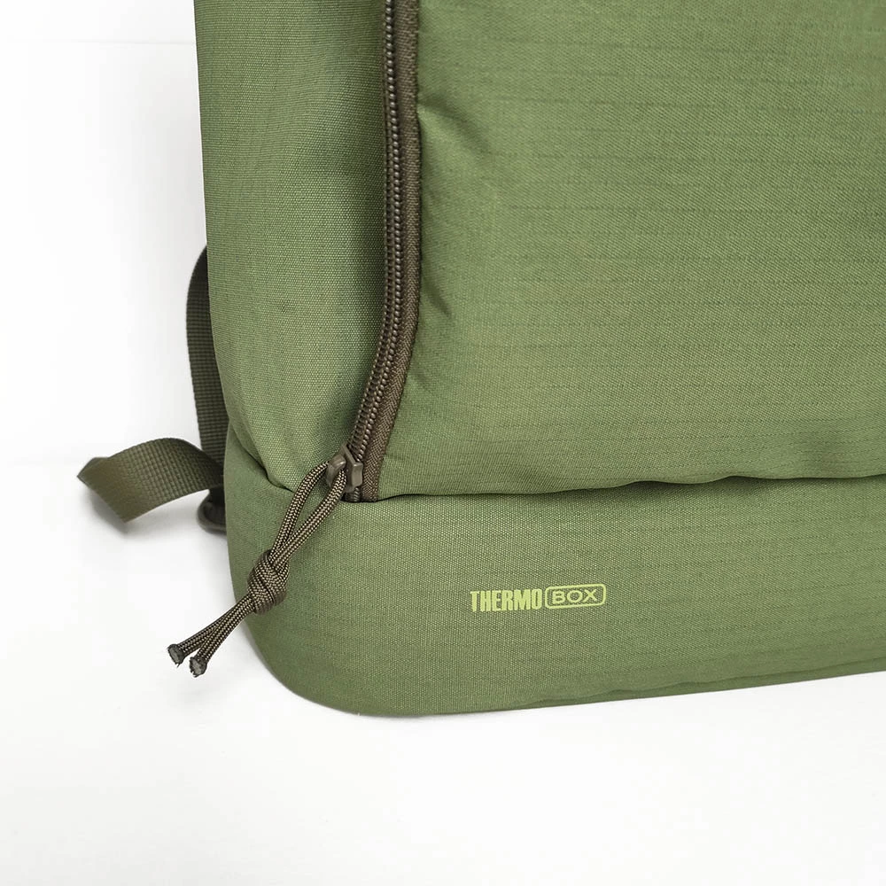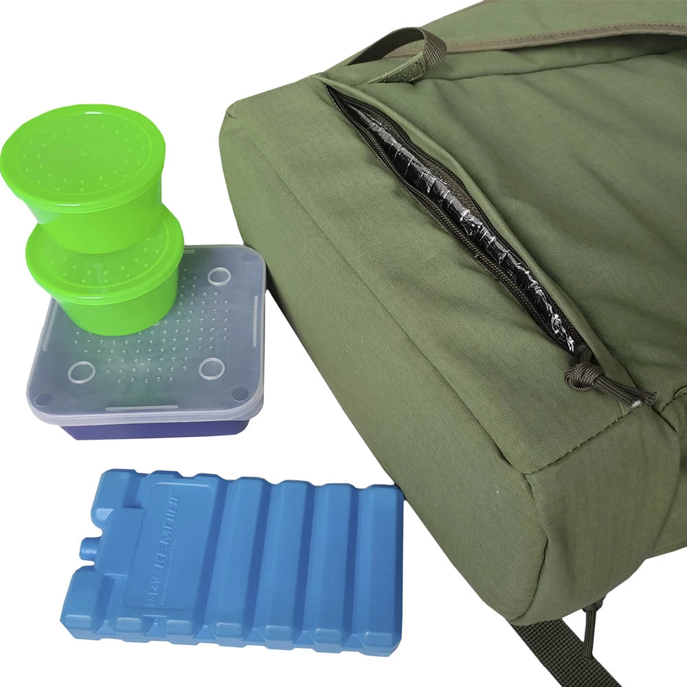 В нижній частині наплічника знаходиться термовідділення (зовн. розміри - 32х17х6см) для 3-х коробочок для наживки (G011 та 2шт G02) та акумулятора холоду. Це відділення закривається на замок зі сторони спини. Слід відзначити , ергономічну спинку та плечові лямки. Рюкзак комфортно нести на плечах.
