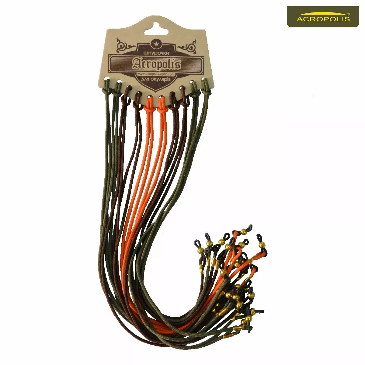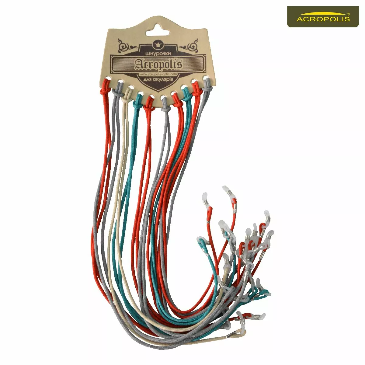 Корисний аксесуар від фірми Акрополіс. Представлений широким асортиментом кольорів: від класичного білого, сірого та чорного до яскравих оранжевого, зеленого і голубого. Основне призначення шнурка – надійно зафіксувати окуляри, так щоб не згубити і не знищити їх. З іншої сторони, шнурок з окулярами часто вішають на шию, щоб в разі потреби швидко зняти чи вдягнути «очка». Спеціальними затискачами з гуми шнурок кріпиться до дужок оправи. Матеріал зносостійкий та пластичний, розрахований на щоденне використання.