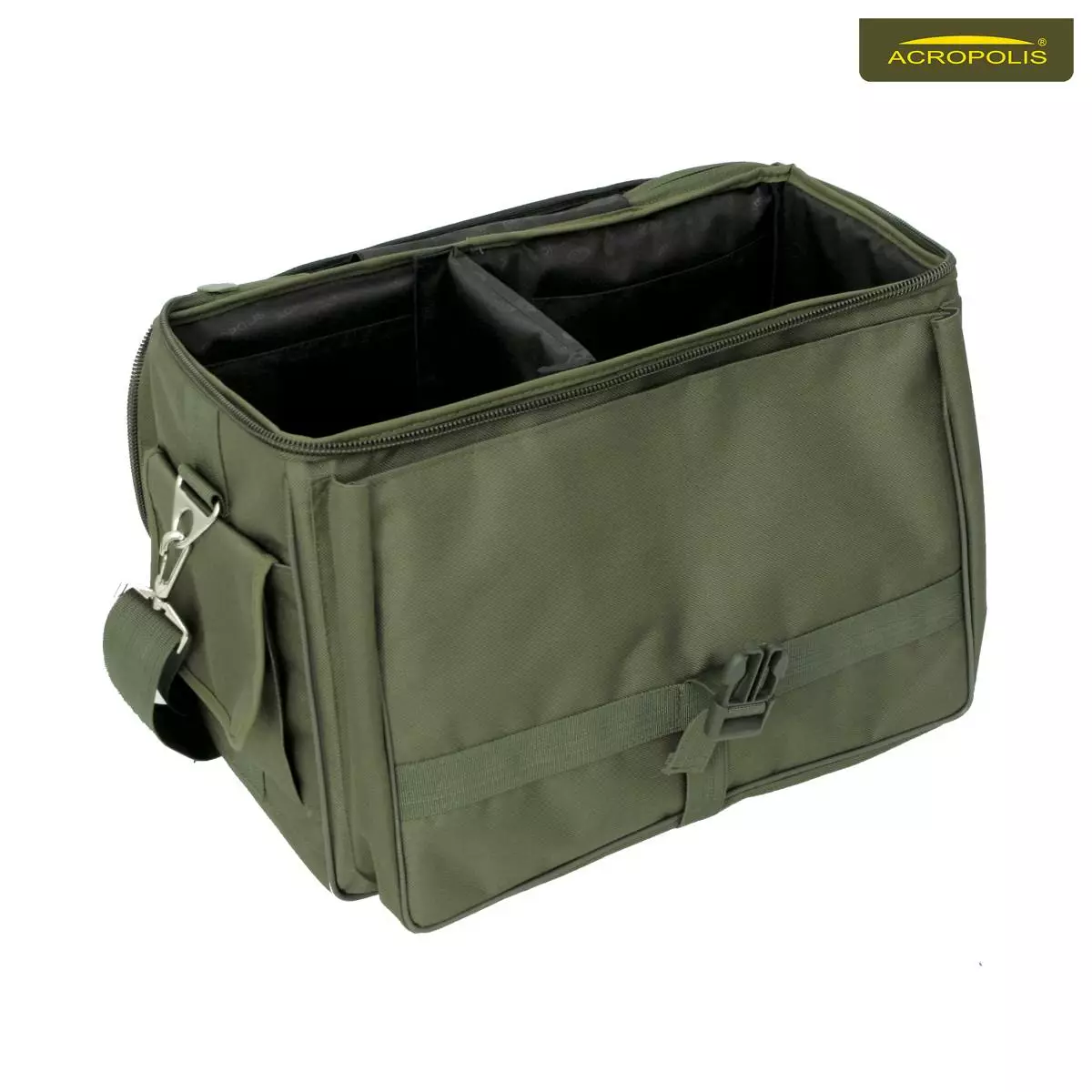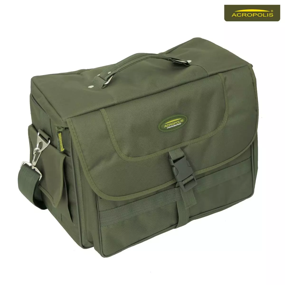 Центральне відділеня з жорсткою мобільною перегородкою на липучці (застібка "Velcro"). Спеціальне місце під рибальську пластмасову коробку для снастей. По боках та спереду запасні відділення та кишені для рибацьких аксесуарів. В комплекті з сумкою іде зручний плечовий ремінь на металевих карабінах. На верхній кришці - ручка для транспортування. Закривається сумка на клапан з застібкою типу "тризуб".