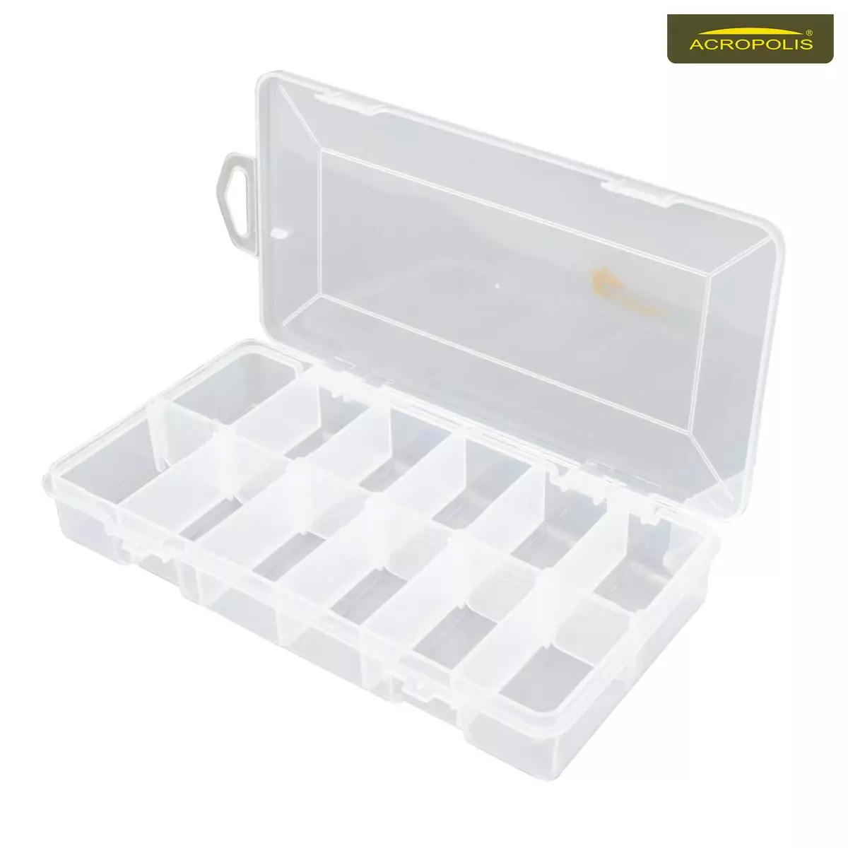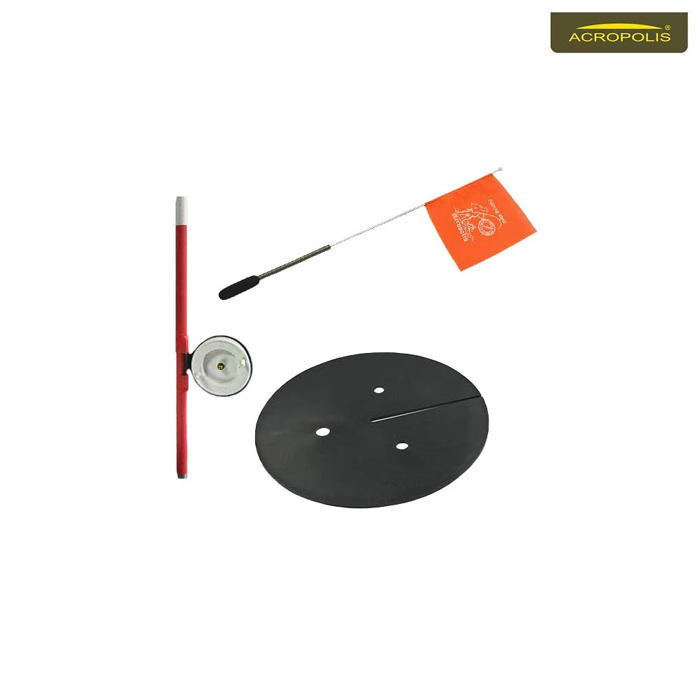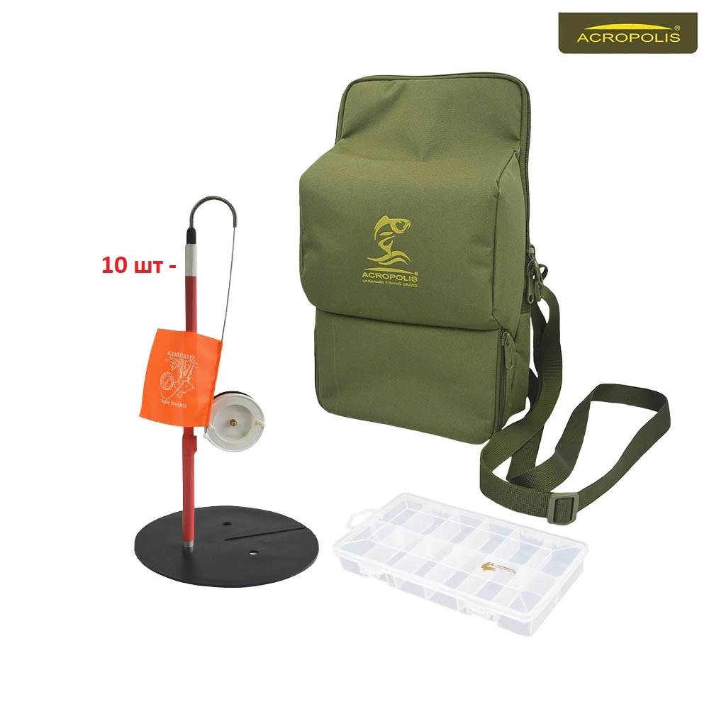 Набір Акрополіс СЖ-1у - сумка рибальська Acropolis, укомплектована 10-ма складними зимовими жерлицями та рибальською коробкою з пластмаси МВН004. Сумка СЖ-1 - на три відділення для зберігання розбірних елементів від снастей та аксесуарів. Круглі основи жерлиць складають у відділ зі сторони спини. Стійки, оснащені котушками, кладуть в центральне відділення на замку. Пружинні стержні з світловідбивними прапорцями ховаються в середині стійок.