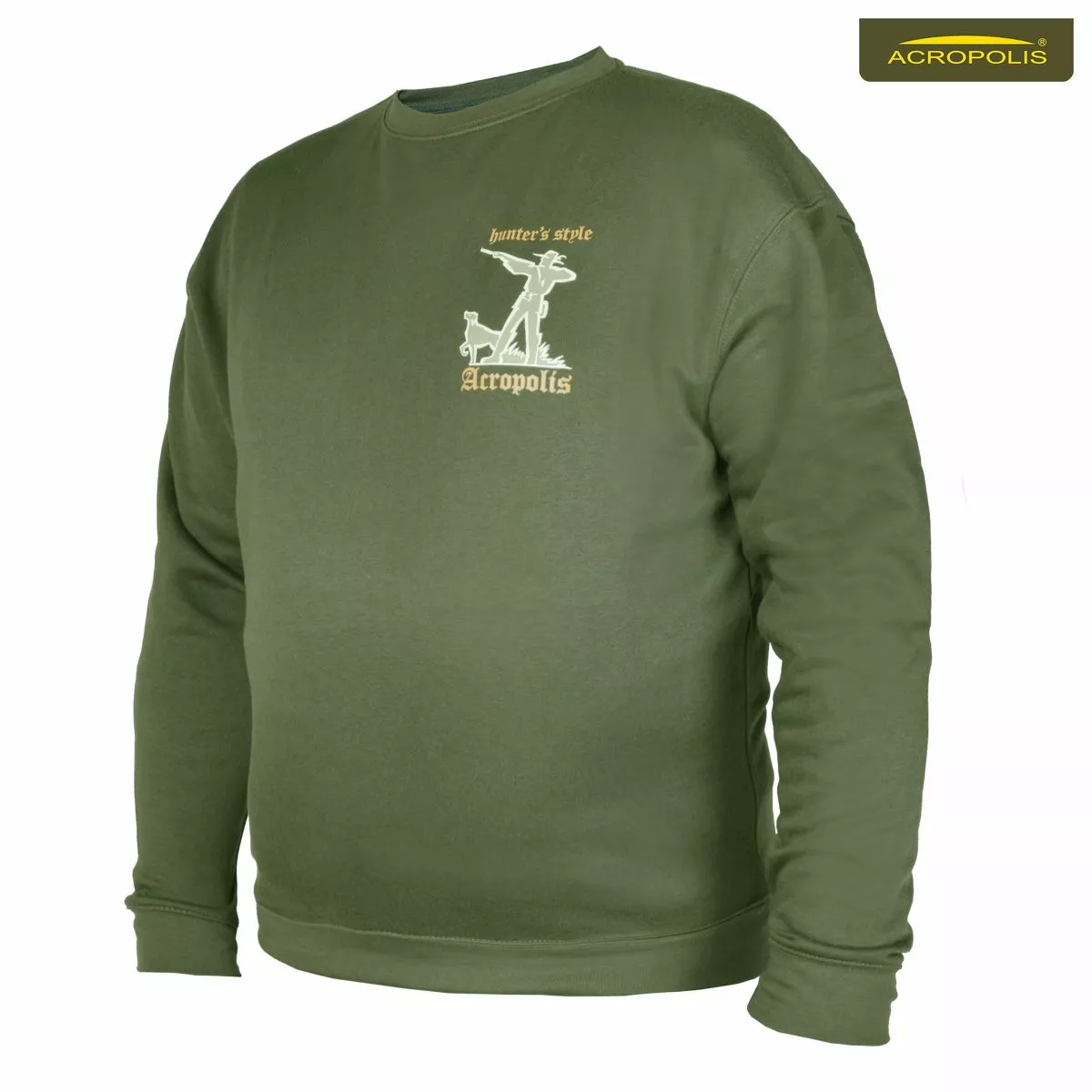 Чоловічий светр кольору хакі для мисливця з логотипом "hunter`s style". Маскувальний оливковий колір допомагає сховатися в лісі чи на поляні під час літнього полювання. Светр демісезонний. Носять як сам, так і під верхнім одягом - курткою, плащем, дощовиком.