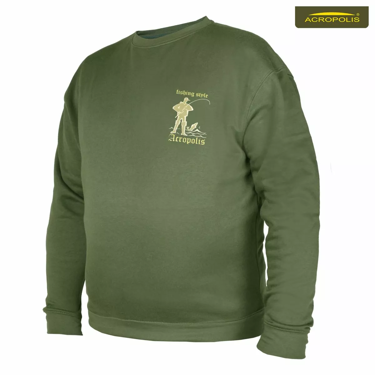 Светр на довгий рукав оливкового кольору. На передній частині методом шовкодруку нанесено зображення рибака з вудочкою і рибою на озері. Часто купують на подарунок чоловікам, які полюбляють їздити на природу до річки, моря. В асортименті і маленькі, і великі розміра для людей різного росту і комплекції. Практичний матеріал, комфортний крій, якісна резинка, заокруглений верхній виріз робить виріб популярним серед клієнтів. Недорогий светр купляють для того, щоб одягати кожного дня на роботу або прогулянку. З іншої сторони, завдяки тематичному рибальському малюнку він зацікавлює рибаків та людей, які працюють в сфері вилову та торгівлі рибою.