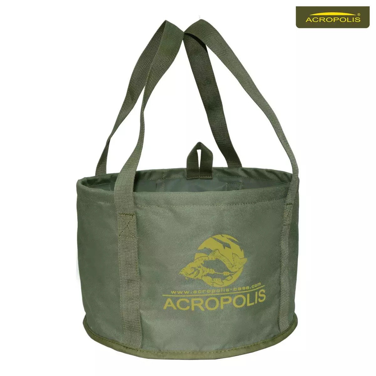 Якісне м‘яке відро для замішування, зберігання та переносу прикормки для мирної поплавкової рибалки. Має складну конструкцію, в складеному вигляді займає мало місця в рибальській сумці. З боків, міцно пришиті армованими нитками, дві ручки з ремінного матеріалу для транспортування відер на плечі або в руках. Пружинний верх відерка допомагає під час замішування прикорму на риболовлі.